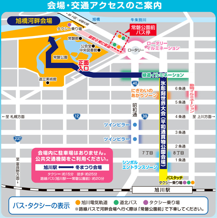 また冬まつり開催中は交通規制が敷かれ、周辺道路は渋滞が長時間続きますので、公共交通機関の利用を強くおすすめします。