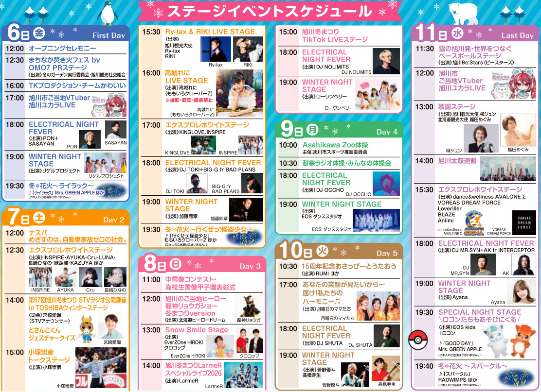 旭川冬まつりが開催される6日間の中で、それぞれ多彩なイベントが開催されます。