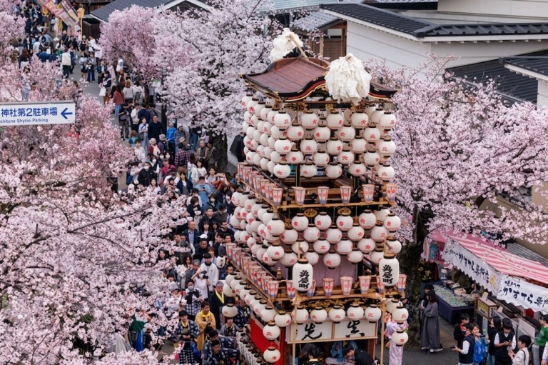 満開の桜並木の中を、豪華絢爛な13輌の車山(やま)が練り歩く姿は、まさに動く芸術品。